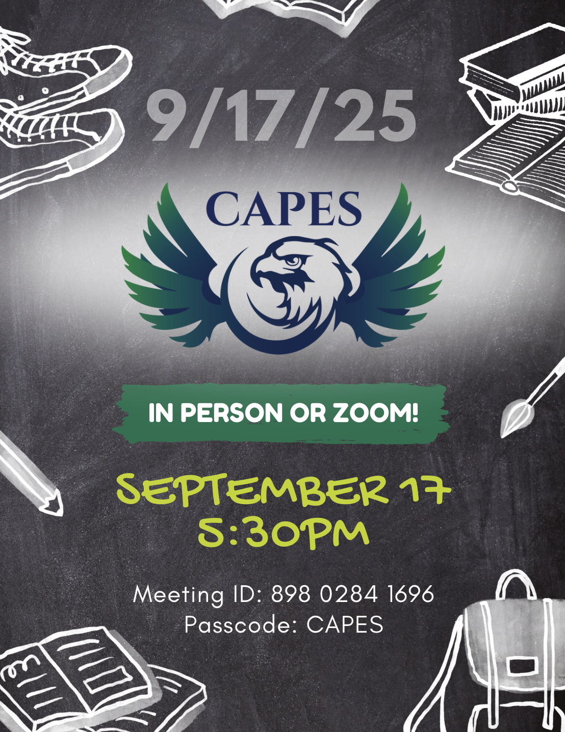 Meeting ID: 898 0284 1696 Passcode: CAPES